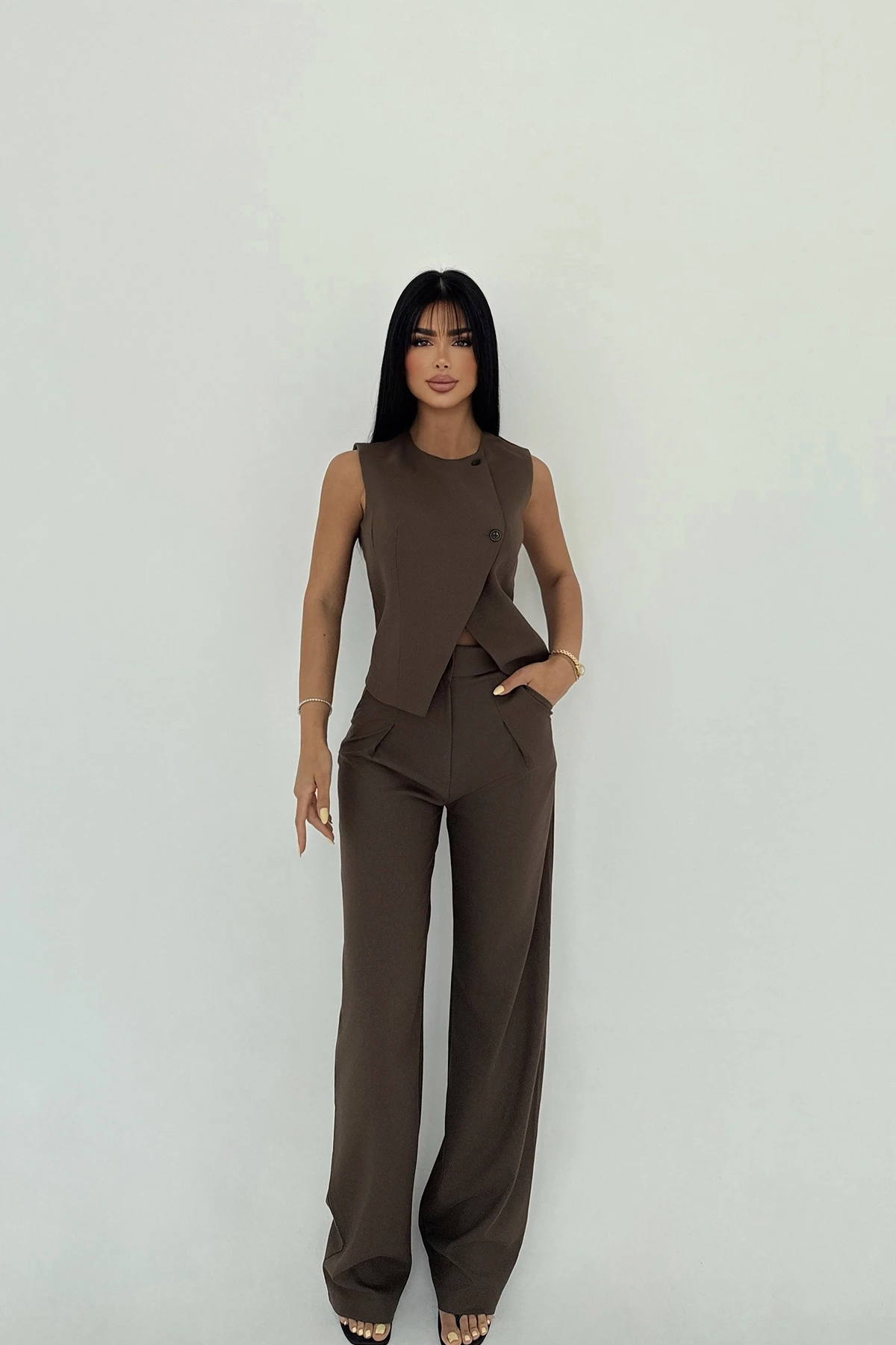 Brown Trouser Suit XS size is used in the image. Top Length: 54 cm Chest: 42 cm Bottom Length: 106 cm Waist: 35 cm Model Measurements Height 158 Weight 52 Chest 80 Waist 62 Hip 93