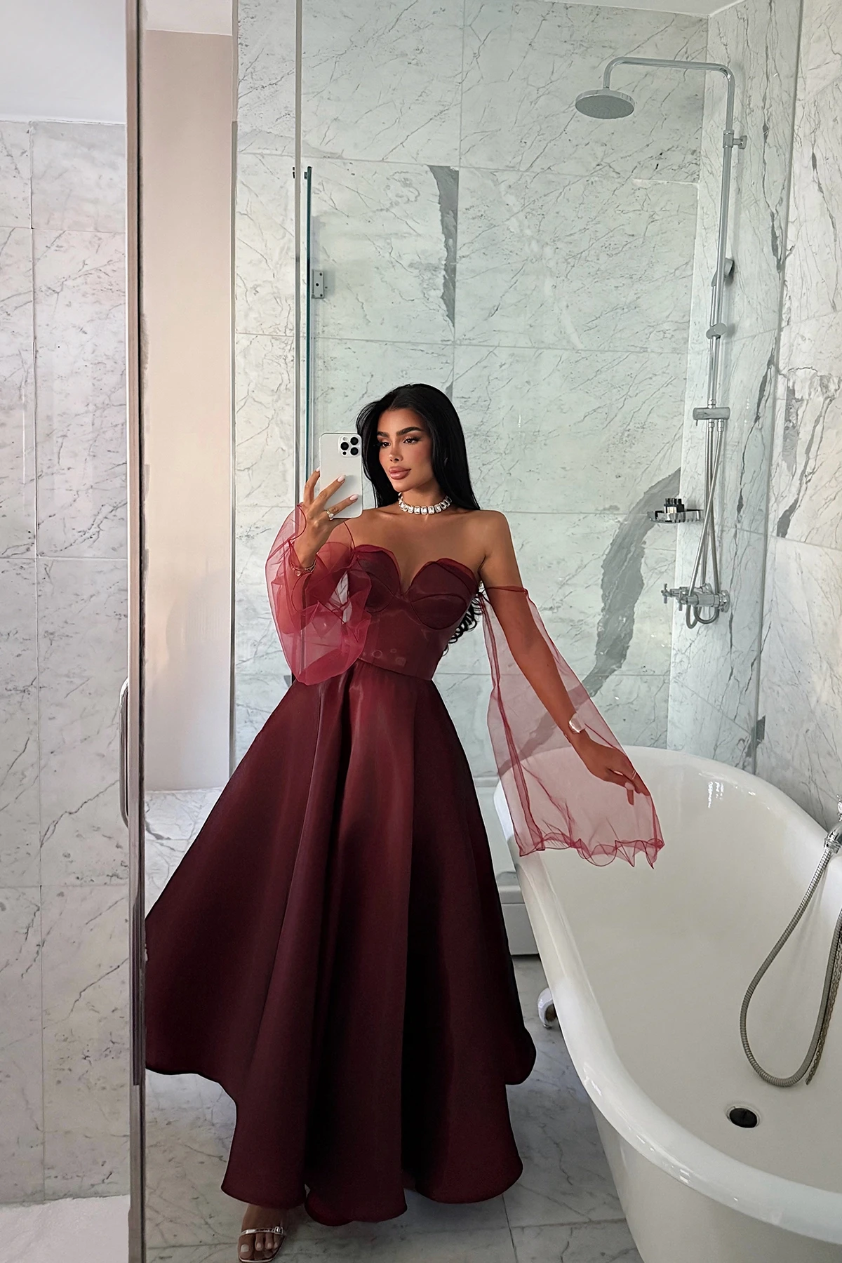 Burgundy Maisy Evening Dress Size XS is used in the image. Height: 120 cm, Waist: 34 cm, Chest: 37 cm Model Measurements: Height: 158 cm, Weight: 52 cm, Chest: 80 cm, Waist: 62 cm, Hips: 93 cm