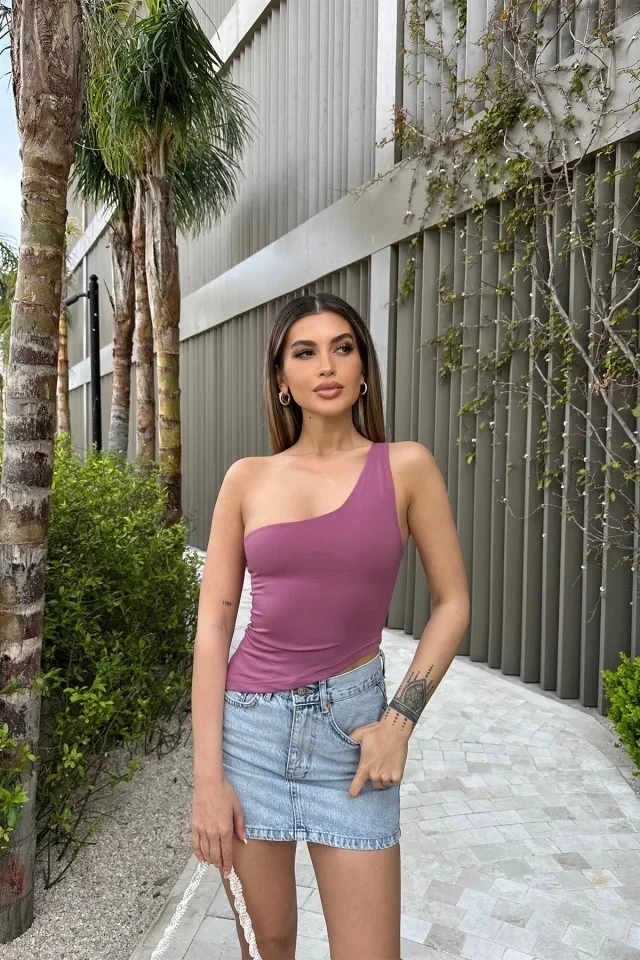 Cherry Rotten One Shoulder Blouse Made from Sandy Fabric Size S is used in the image Blouse Length:33cm Bust:26cm Model Measurements: Height: 171 Weight: 55 Chest: 85 Waist: 65 Hip: 105