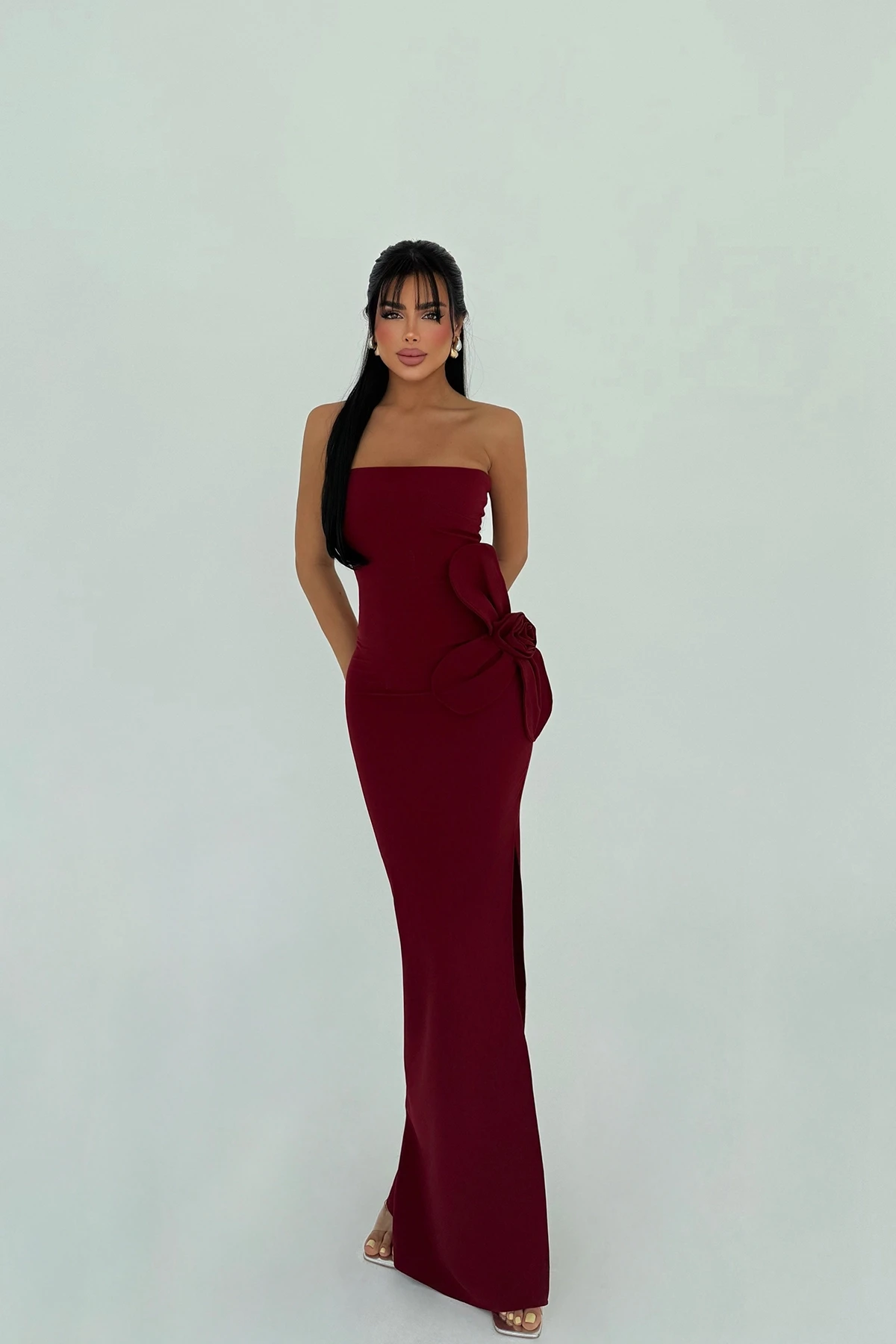 Claret Red Daysi Strapless Dress XS size is used in the image. Made of Double Fabric. Length: 127 cm Waist: 39 cm Chest: 36 cm Model Measurements Height 158 Weight 52 Chest 80 Waist 62 Hip 93