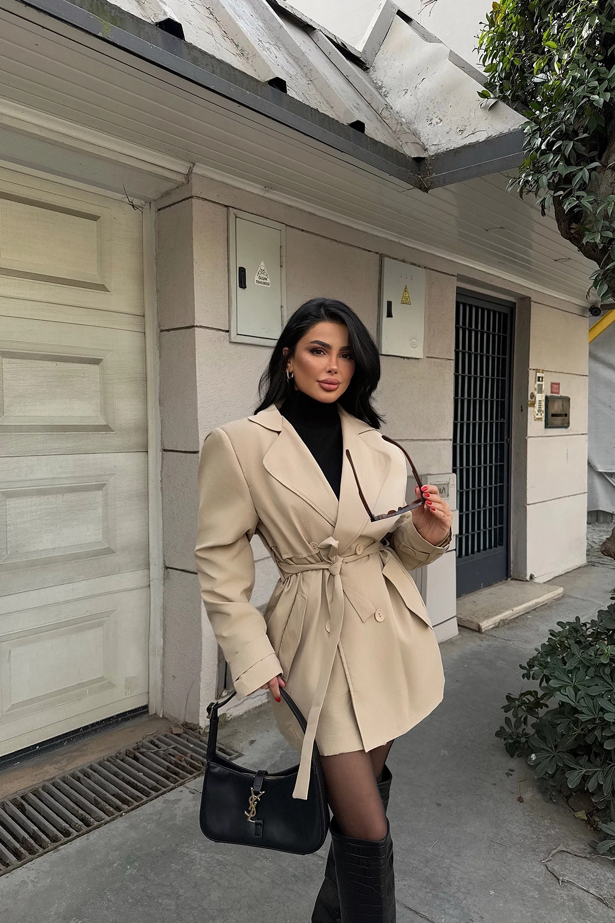 Cream Alessandro Short Trench Coat Size XS is used in the image. Height: 84 cm Bust: 55 cm Model Measurements Height 158 Weight 52 Chest 80 Waist 62 Hip 93