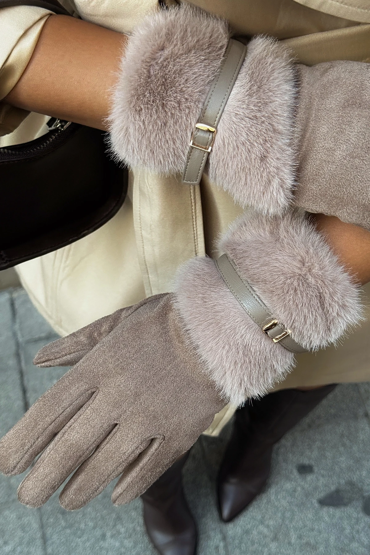 Cream Fur Belted Gloves