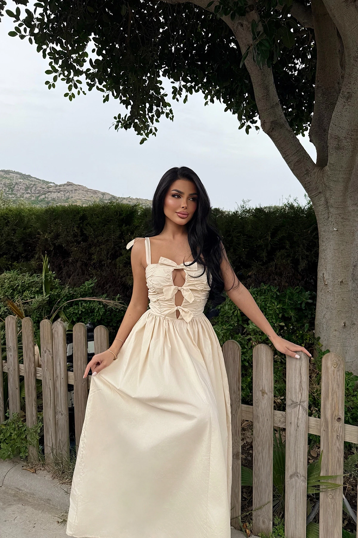 Cream Mirabelle Long Dress Made of Poplin Fabric. Length: 120 cm Waist: 32 cm Chest: 40 cm XS size is used in the image. Model Measurements Height 158 ​​Weight 52 Chest 80 Waist 62 Hip 93