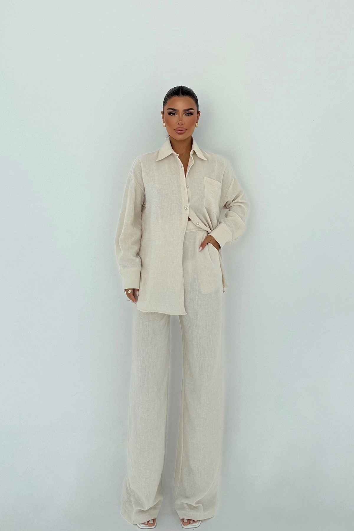 Cream Pocket Detail Trouser Suit Size XS is used in the image. Top length 78 cm, Chest 36 cm, Bottom length 113 cm, Waist 34 cm Model Measurements: Height 158 cm, Weight 52 cm, Chest 80 cm, Waist 62 cm, Hips 93 cm