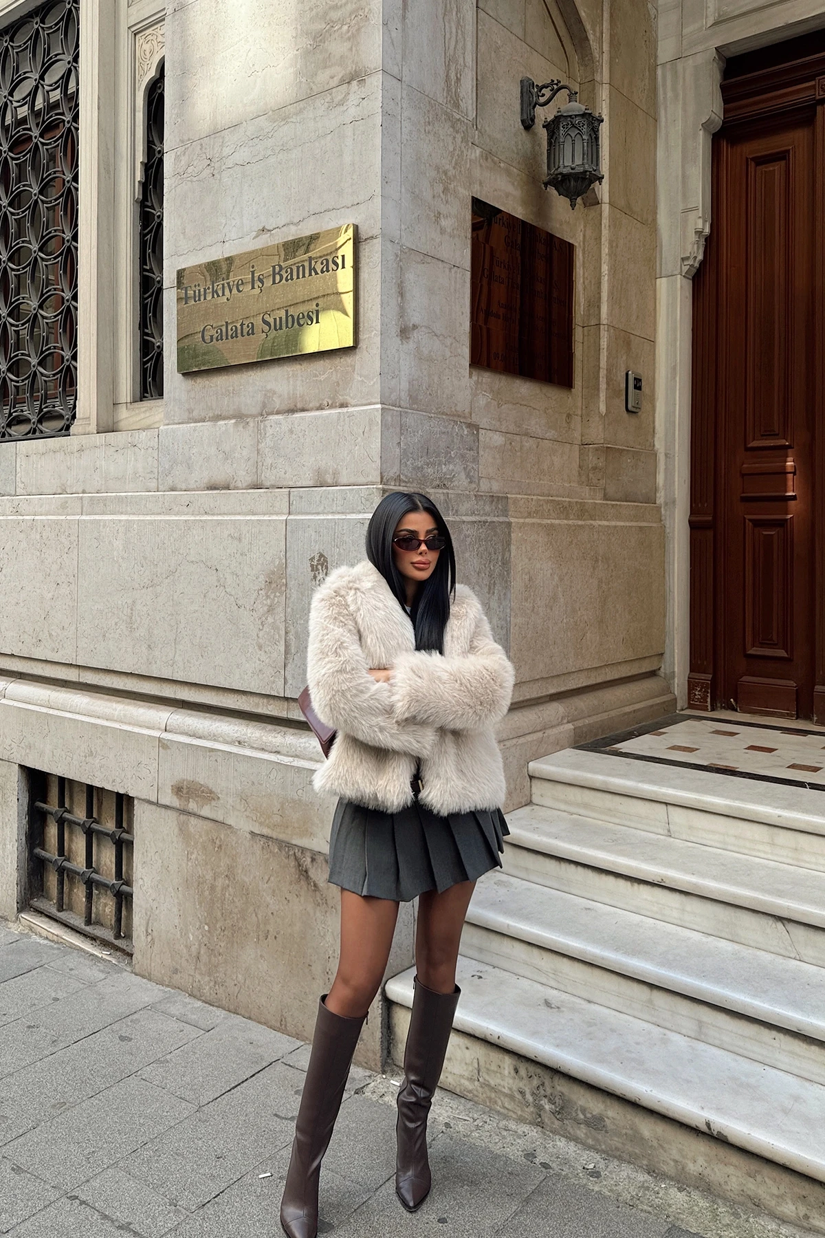 Cream Short Fur XS size is used in the image. Made of Imported Fur Fur Length: 67cm Chest: 64cm Model Measurements Height 158 ​​Weight 52 Chest 80 Waist 62 Hip 93