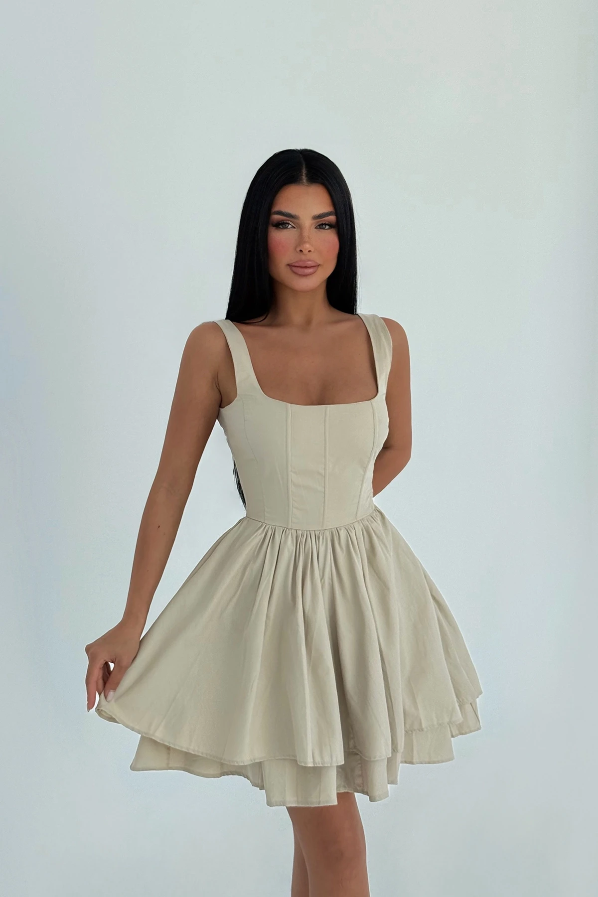 Cream Strap Dress XS size is used in the image. Height: 84 cm Waist: 36 cm Chest: 33 cm Model Measurements Height: 160 Weight: 50 Chest: 80 Waist: 62 Hip: 94