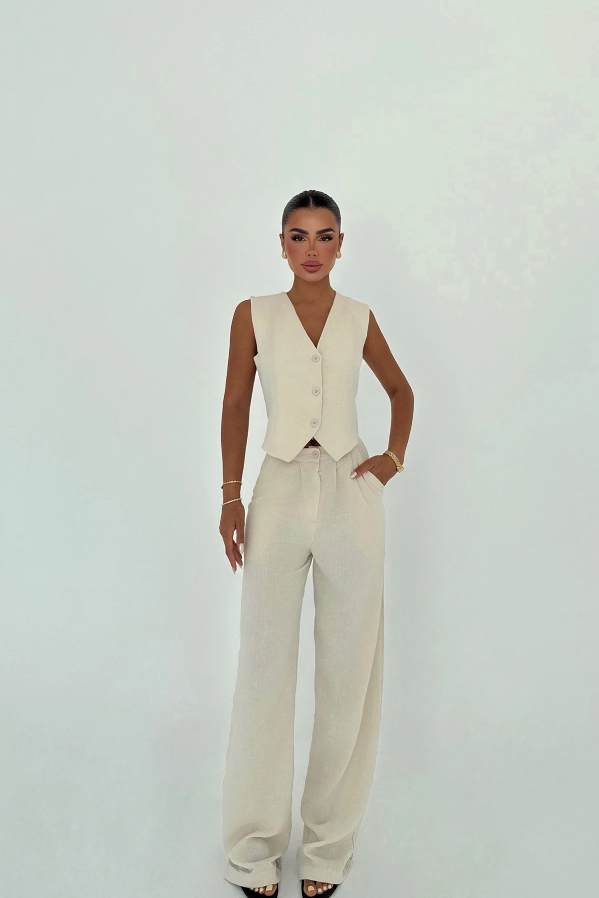 Cream Trouser Suit XS size is used in the image. Top Length: 49 cm Chest: 43 cm Bottom Length: 109 cm Waist: 31 cm Model Measurements Height 158 Weight 52 Chest 80 Waist 62 Hip 93