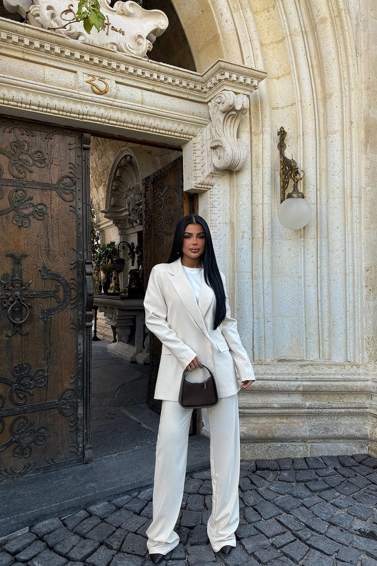 Cream Trousers Set Size XS is used in the image. Made from Plain Fabric. Top Length: 77 Cm Bust: 48 Cm Bottom Length: 115 Cm Waist: 31 Cm Model Measurements Height 158 Weight 52 Chest 80 Waist 62 Hip 93