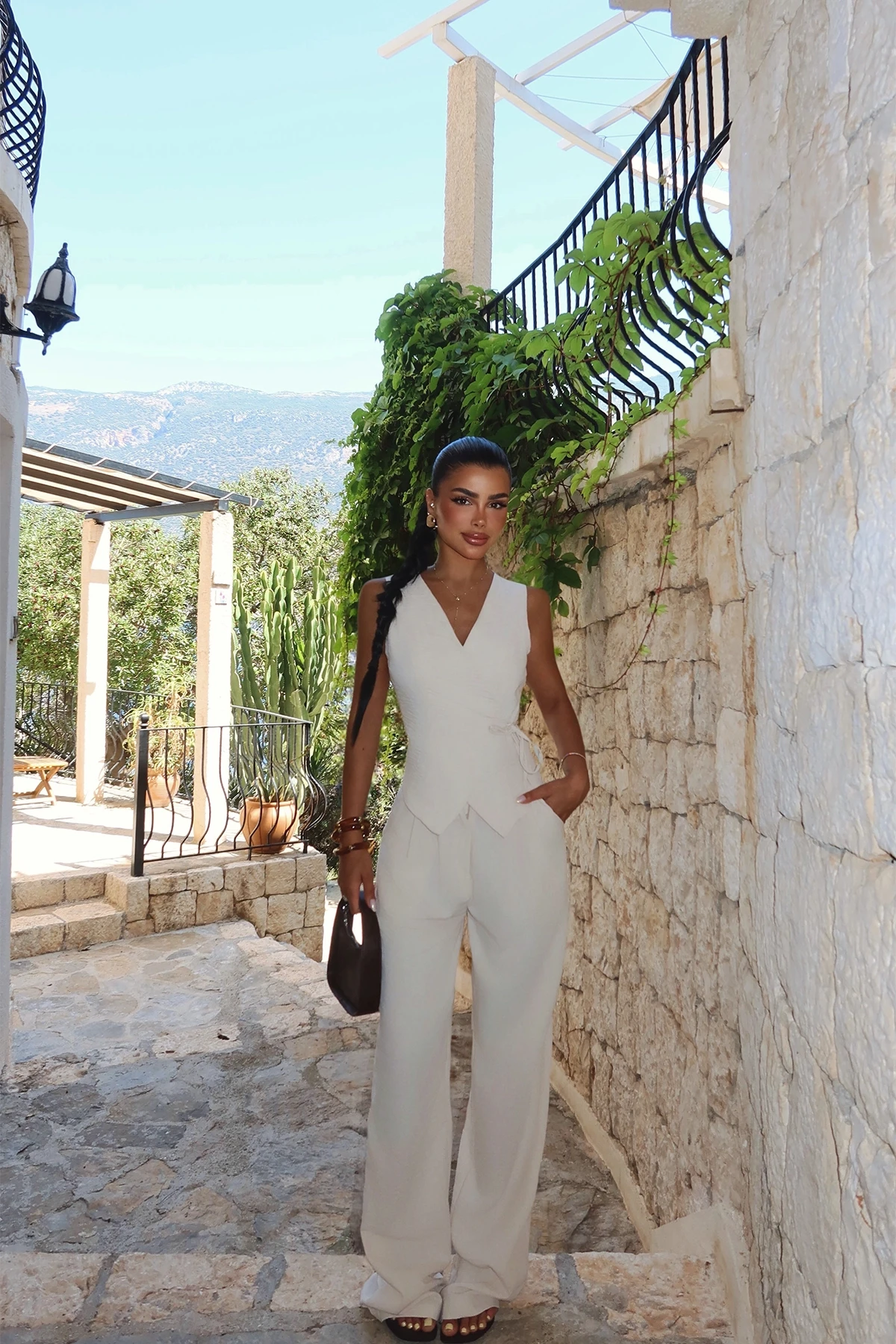 Cream Zaika Suit XS size is used in the image. Top Length: 57 cm Chest: 43 cm Bottom Length: 112 cm Waist: 33 cm Model Measurements Height 158 ​​Weight 52 Chest 80 Waist 62 Hip 93