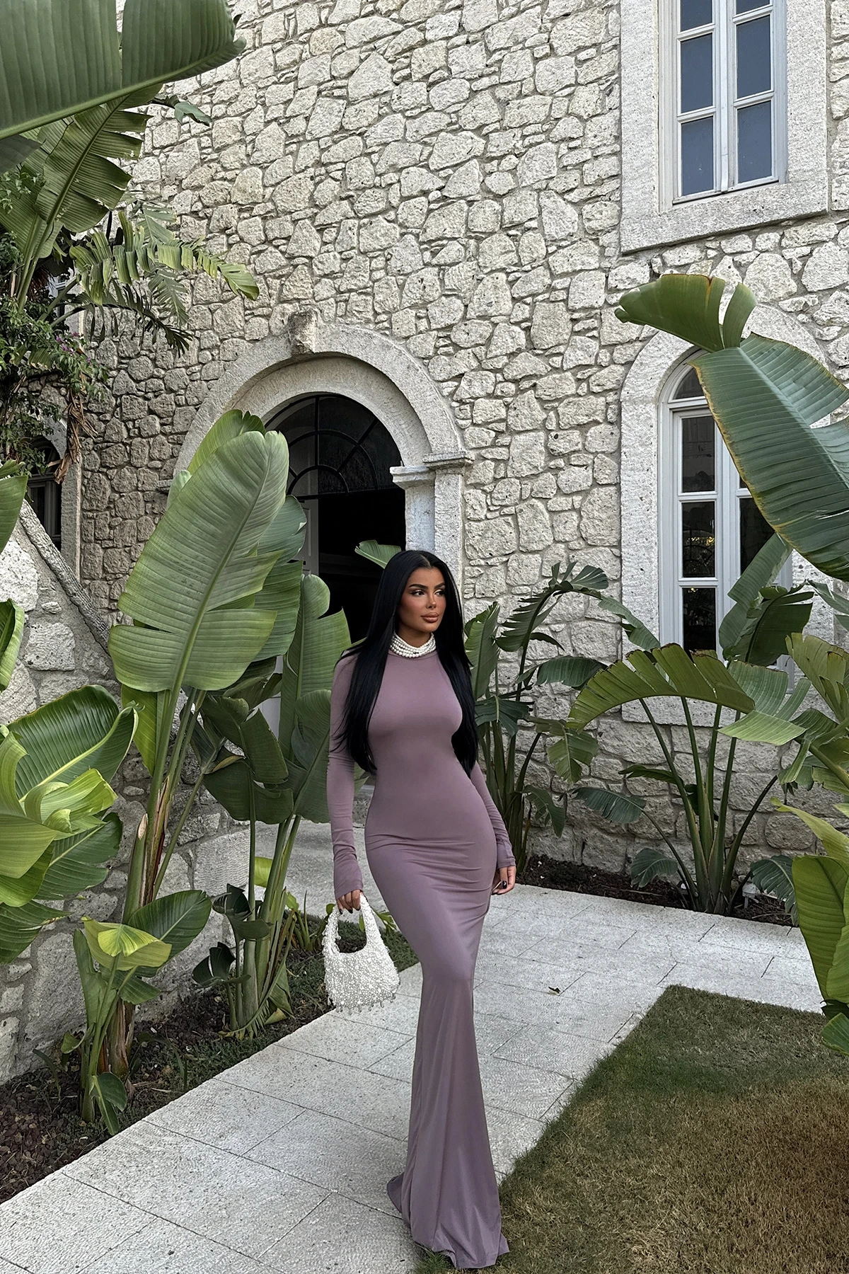 Dusty Rose Doss Long Backless Dress XS size is used in the image. Made of Sandy Fabric. Dress Length: 154 cm Waist: 27 cm Chest: 30 cm Model Measurements Height 158 Weight 52 Chest 80 Waist 62 Hip 93