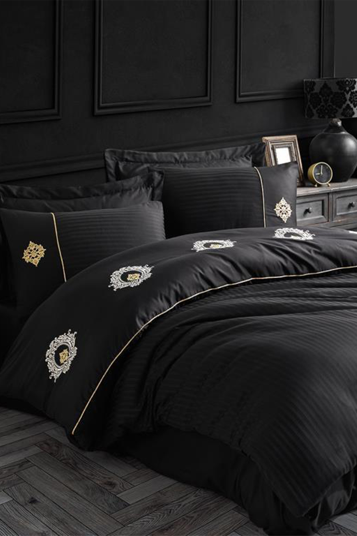 Elegant Nakışlı Pamuk Saten Çift Kişilik Nevresim Takımı Olimpos Siyah