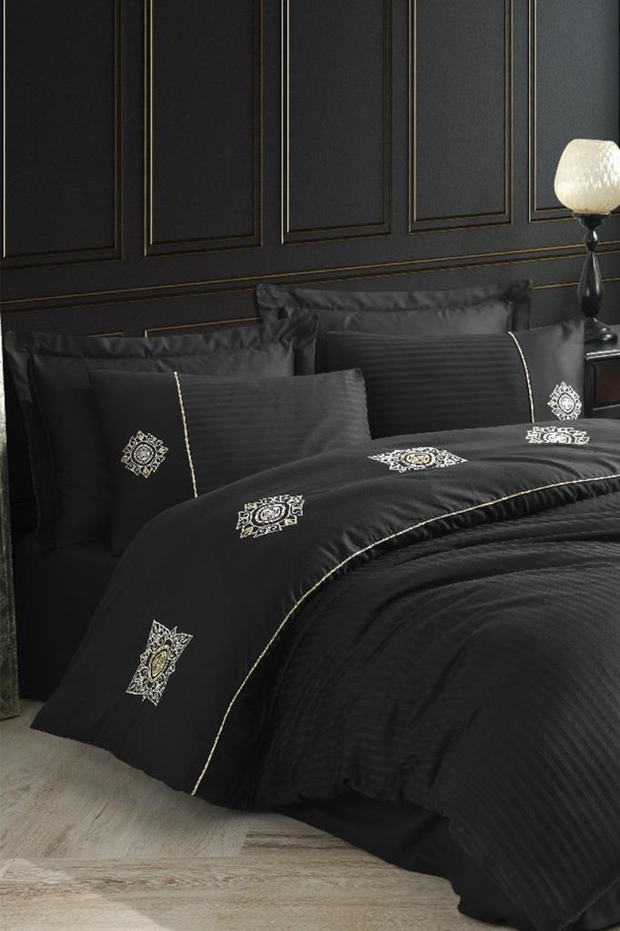 Elegant Nakışlı Pamuk Saten Çift Kişilik Nevresim Takımı Zeugma Siyah