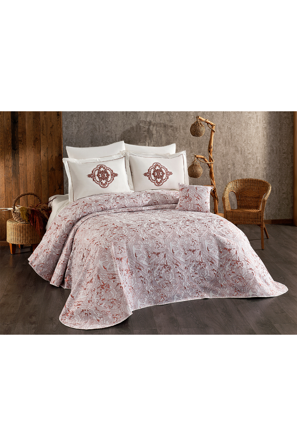 7 PARÇA PİKE TAKIMI Pike: 245x255 cm / 1 adet Çarşaf: 240x260 cm / 1 Adet Nakışlı Yastık Kılıfı: 55x75 cm / 2 adet Uyku Yastık Kılıfı: 50x70 cm / 2 Adet Kırlent kılıfı: 40x40 cm / 1 adet Pike Şönil Kumaştan üretilmiştir. Çarşaf ve Yastık Kılıfları Pamuk kumaştan üretilmiştir. YIKAMA TALİMATI -Makinada veya elde yıkayabilirsiniz max 40 derecede yıkayınız. -Çamaşır suyu ile leke sökücü kimyasallar kullanmayınız. -Yıkama esnasında koyu renkleri mümkün olduğunca ayrı tutunuz. -Ilık ütü ile ütüleyiniz. -Islak bekletmeyiniz. -Kurutma makinasında kurutulabilir.