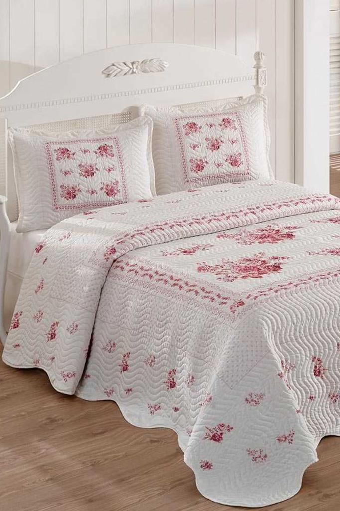 Flower Baskılı Kapitoneli Çift Kişilik Yatak Örtüsü Pembe