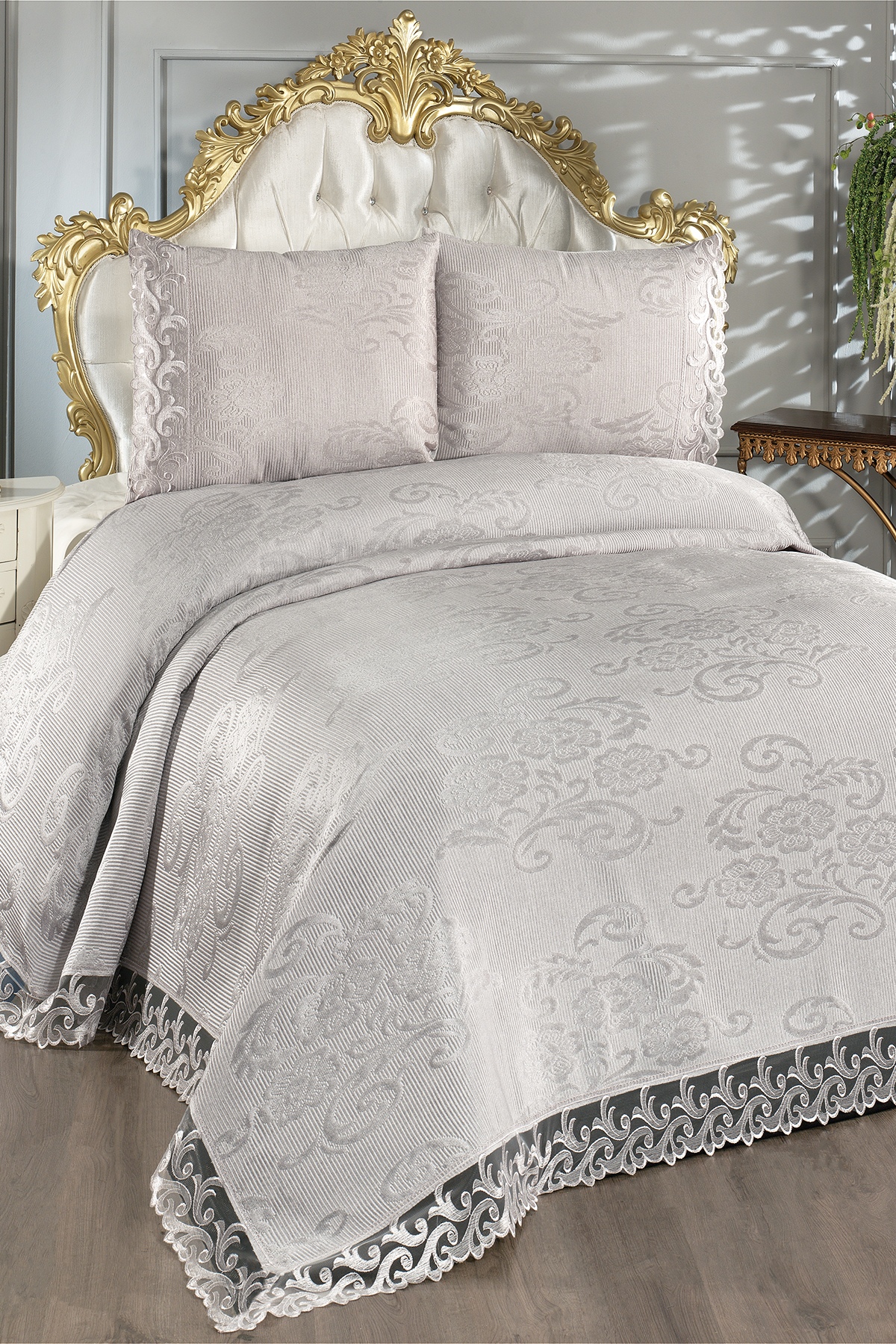Fransız Dantelli Belins Çift Kişilik Yatak Örtüsü Gri