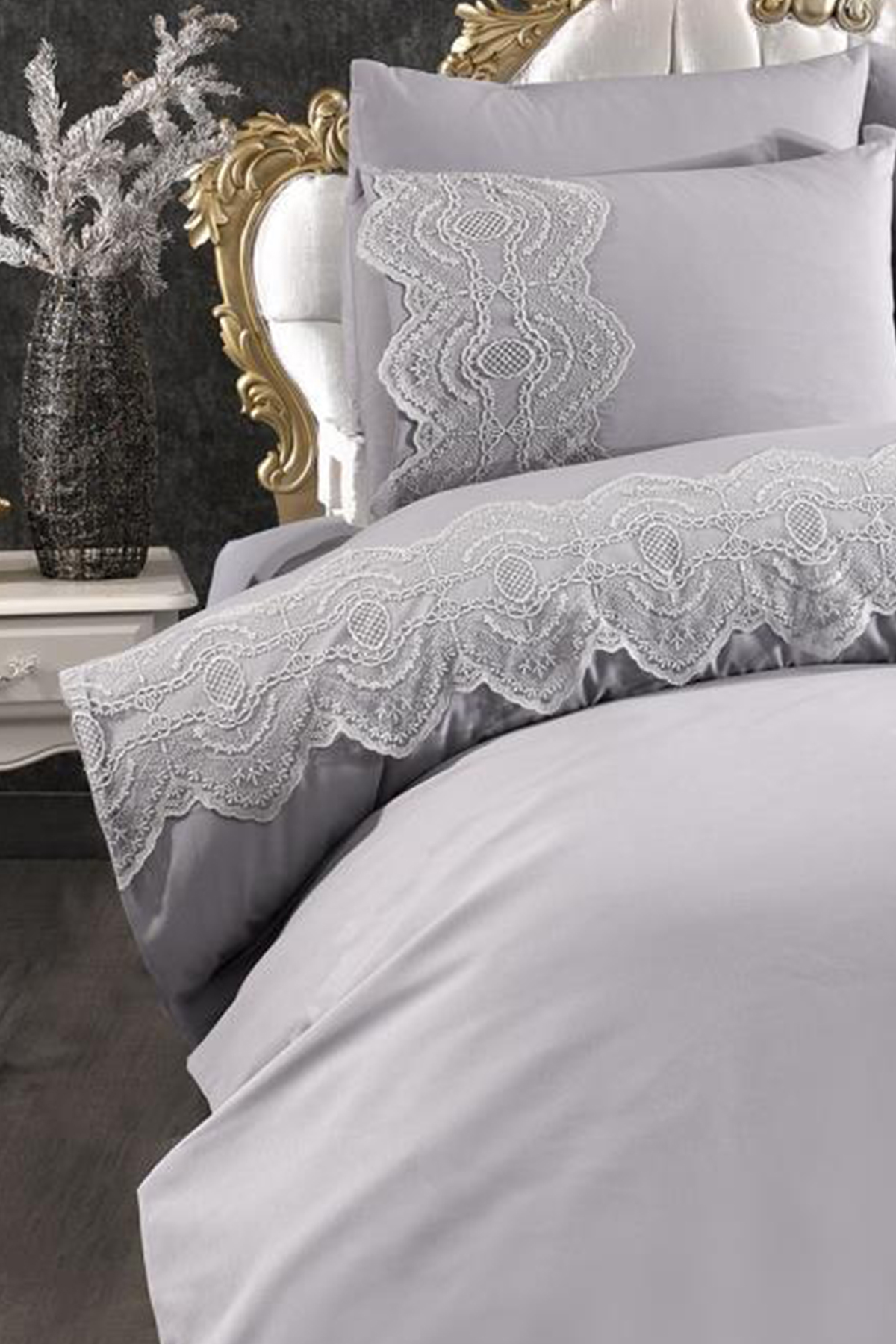 Fransız Dantelli Eslem Çeyizlik Nevresim Takımı Gri