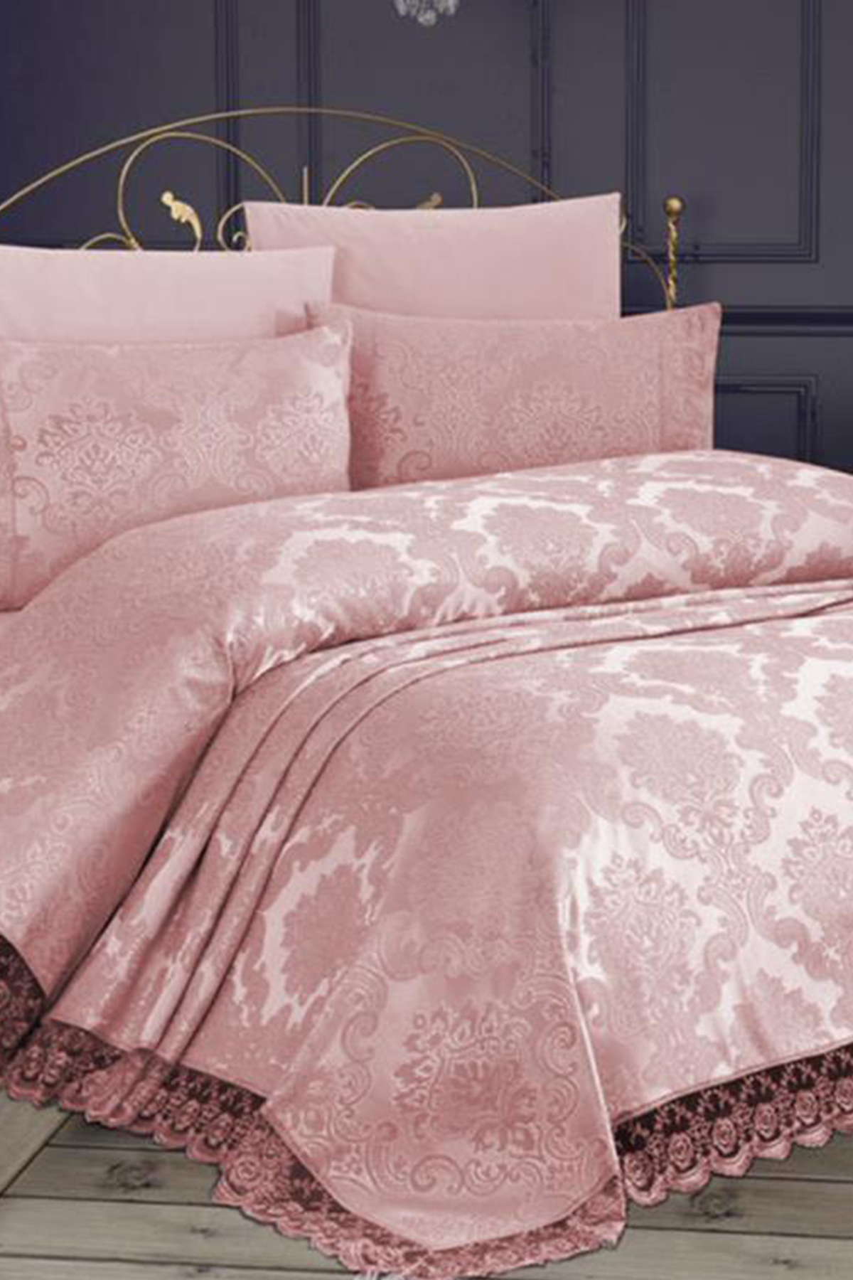 Fransız Dantelli Kure Tek Kişilik Yatak Örtüsü 2 Parça Pudra