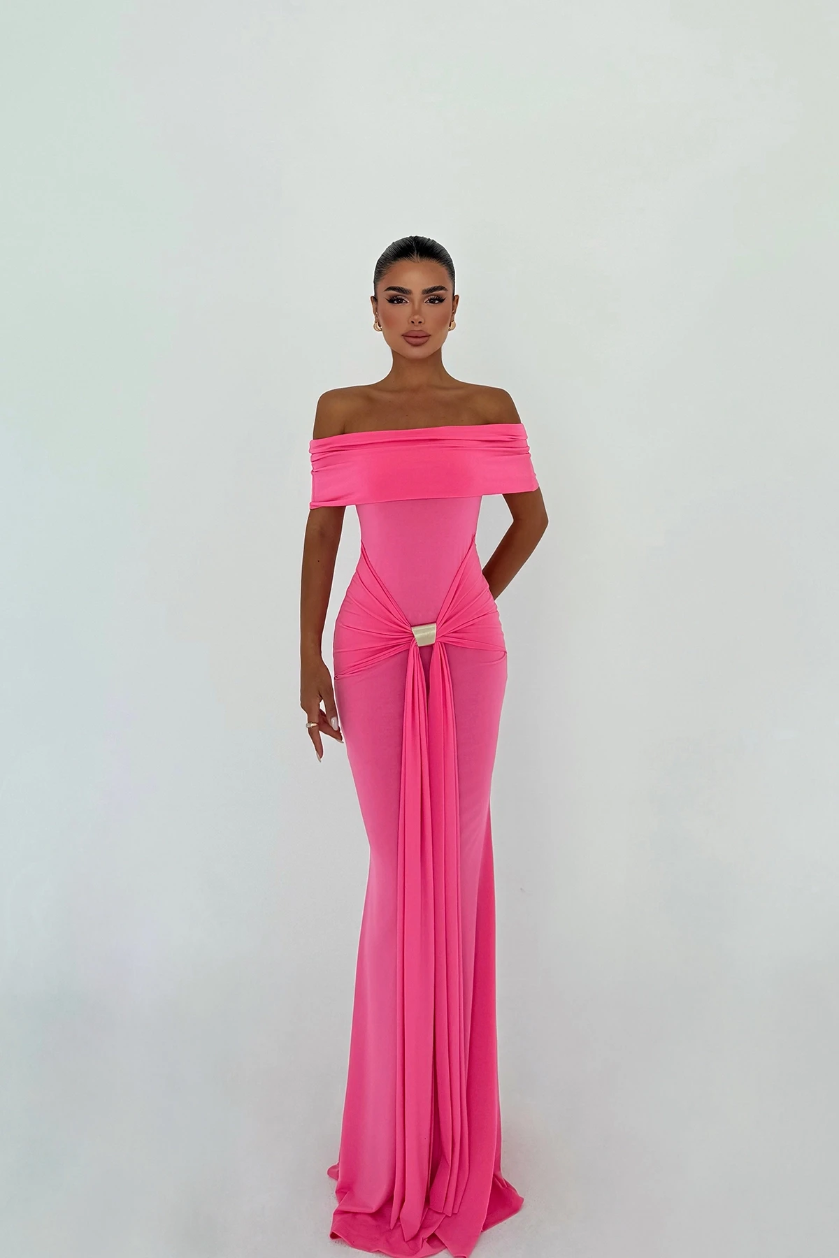 Fuchsia Allayia Long Dress XS size is used in the image. Made of Sandy Fabric. Length: 141 cm Waist: 36 cm Chest: 42 cm Model Measurements Height 158 Weight 52 Chest 80 Waist 62 Hip 93