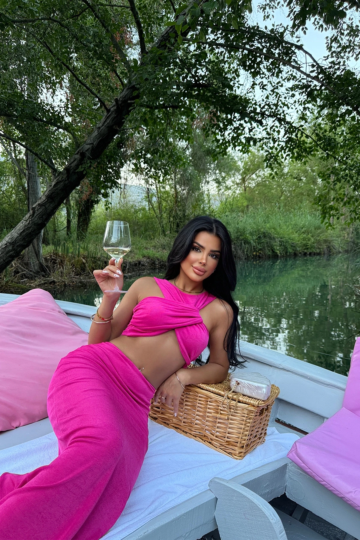 Fuchsia Santina Set Made from buzzy fabric Size S is used in the image. Suit top length 38 cm, Chest 31 cm, Bottom length 113 cm, Waist 29 cm Model Measurements: Height: 160 Weight: 50 Chest: 80 Waist: 62 Hip: 94