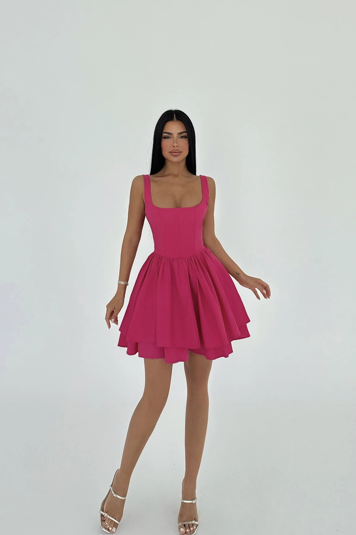 Fuchsia Strap Dress XS size is used in the image. Height: 84 cm Waist: 36 cm Chest: 33 cm Model Measurements Height: 160 Weight: 50 Chest: 80 Waist: 62 Hip: 94