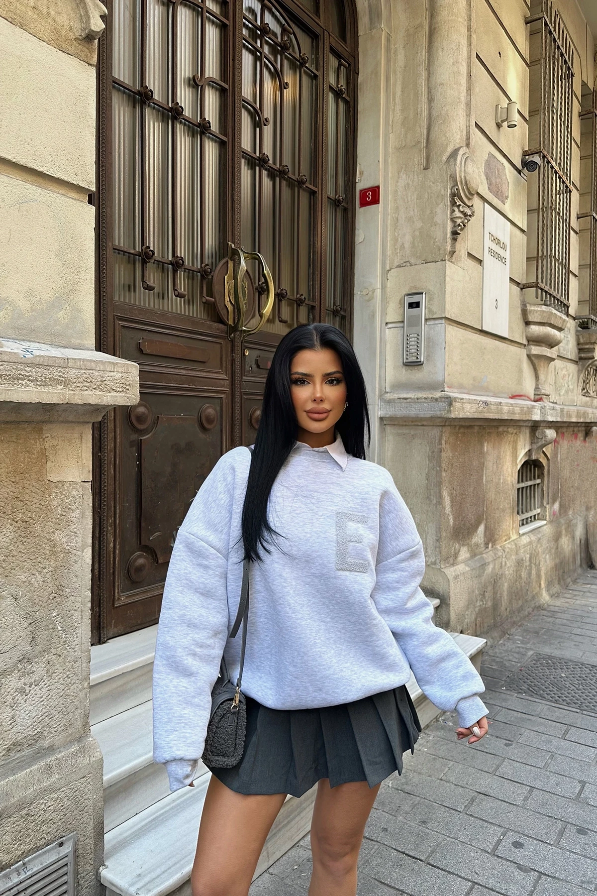Gray E Embroidered Sweat Made from Three Thread Fabric Size S is used in the image Sweat Length:67cm Chest:60cm Model Measurements: Height: 160 Weight: 50 Chest: 80 Waist: 62 Hip: 94