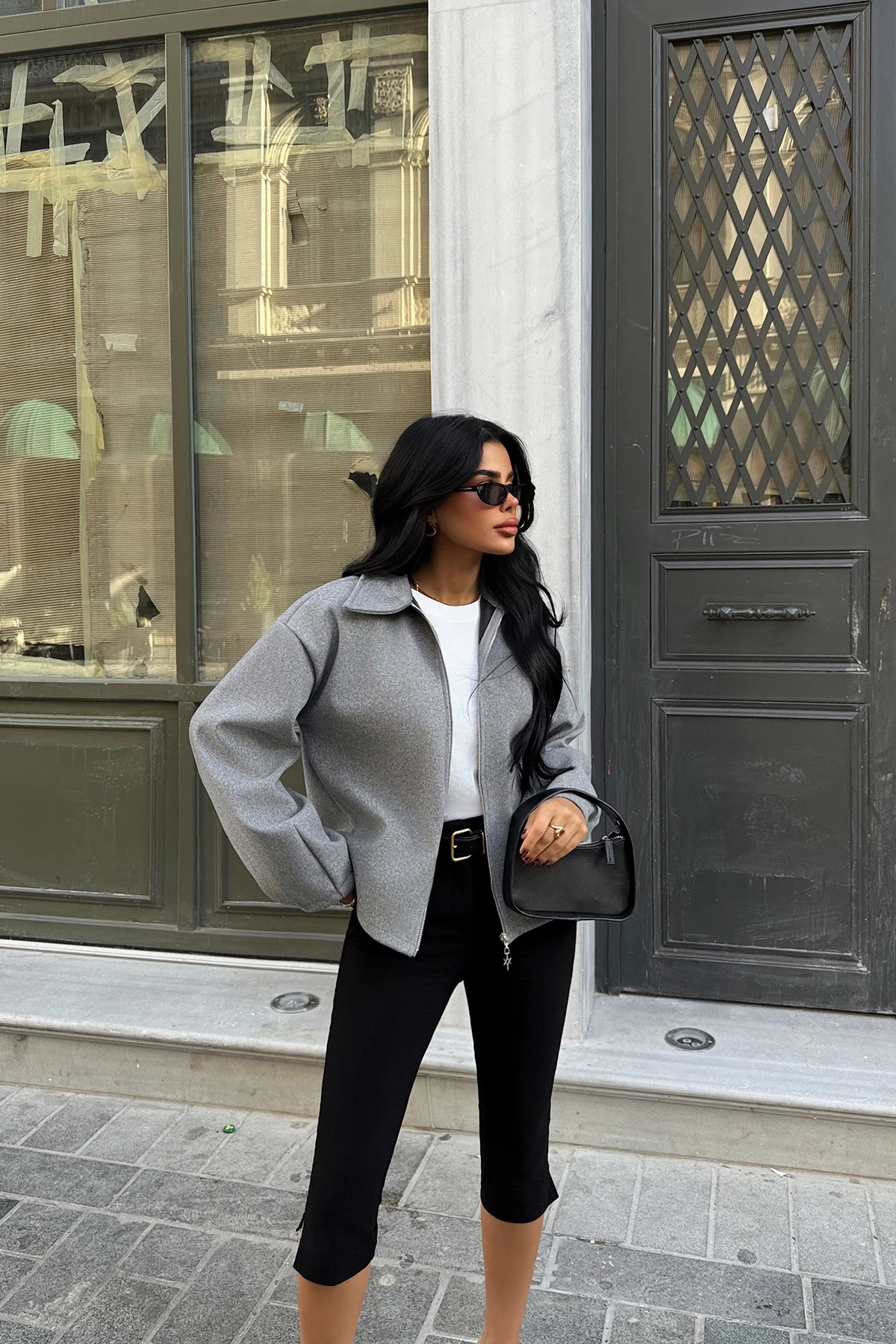 Gray Minato Jacket Size XS is used in the image. Made from Stamped Fabric. Height: 62 cm Bust: 53 cm Model Measurements Height 158 Weight 52 Chest 80 Waist 62 Hip 93