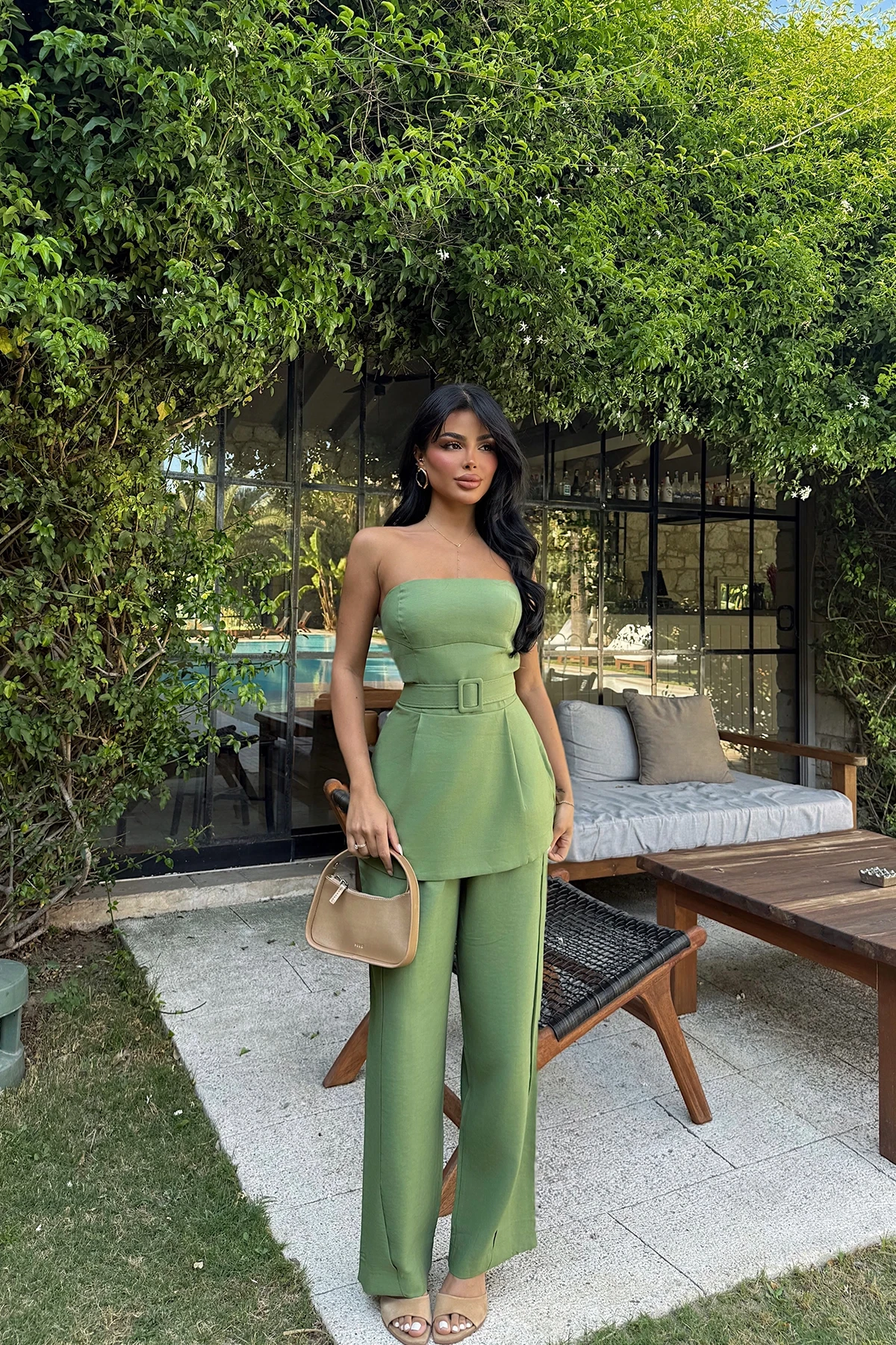 Green Betty Belted Suit XS size is used in the image. Made of Padova Fabric. Upper Length: 54 cm Chest: 37 cm Lower Length: 102 cm Waist: 36 cm Model Measurements Height 158 Weight 52 Chest 80 Waist 62 Hip 93