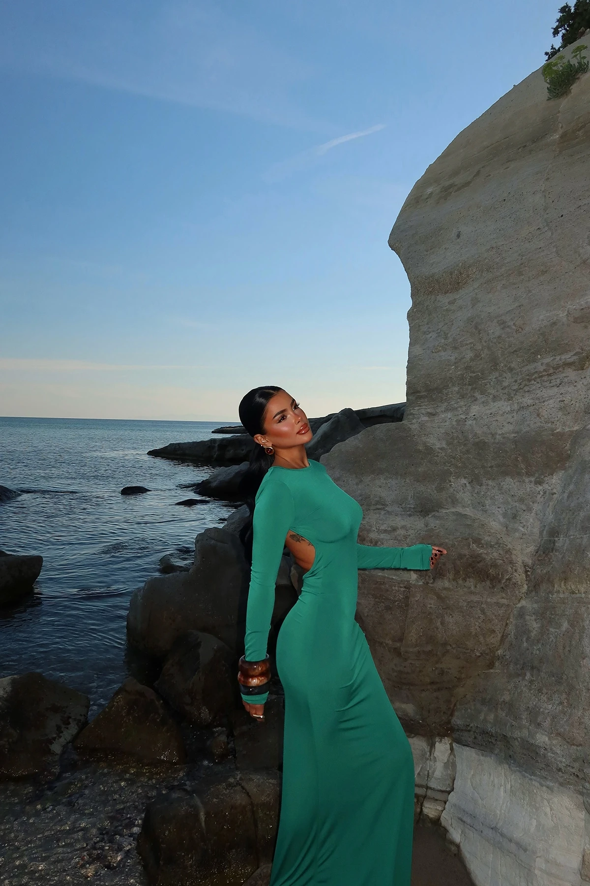 Green Doss Long Backless Dress XS size is used in the image. Made of Sandy Fabric. Dress Length: 154 cm Waist: 27 cm Chest: 30 cm Model Measurements Height 158 ​​Weight 52 Chest 80 Waist 62 Hip 93