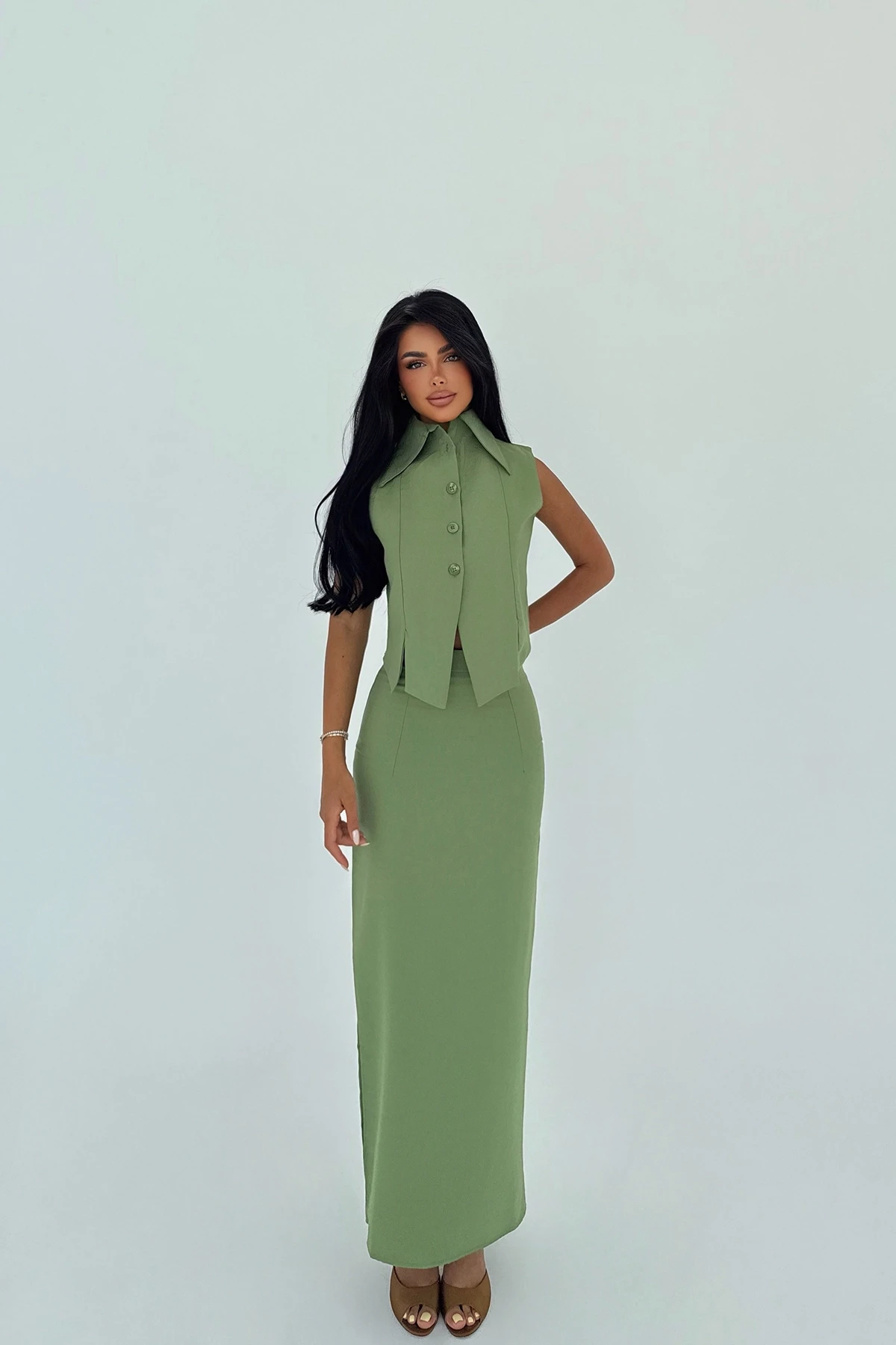 Green Regium Two Piece Set The image uses size XS. Top Length: 56 cm Chest: 49 cm Bottom Length: 92 cm Waist: 36 cm Model Measurements Height 158 ​​Weight 52 Chest 80 Waist 62 Hip 93