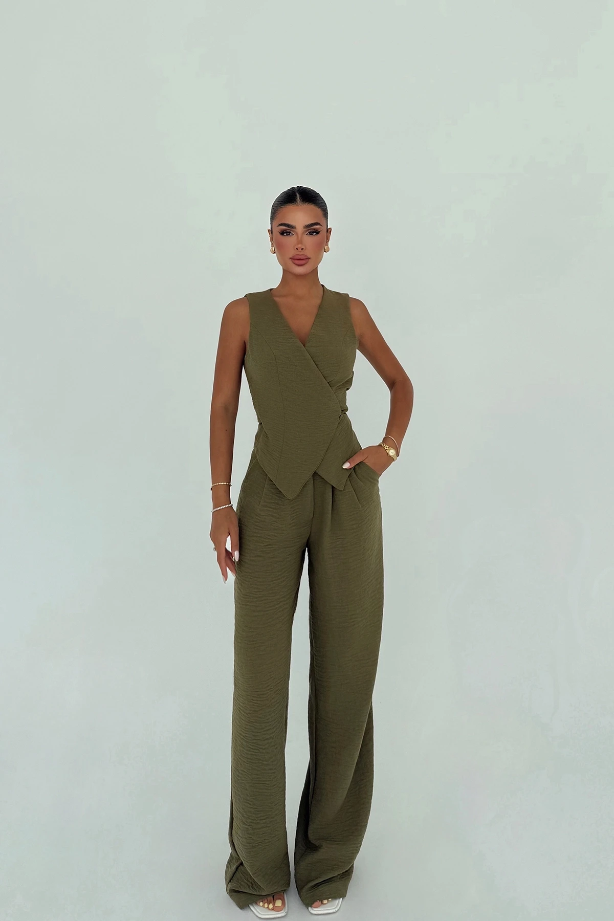 Green Zaika Team XS size is used in the image. Top Length: 57 cm Chest: 43 cm Bottom Length: 112 cm Waist: 33 cm Model Measurements Height 158 ​​Weight 52 Chest 80 Waist 62 Hip 93