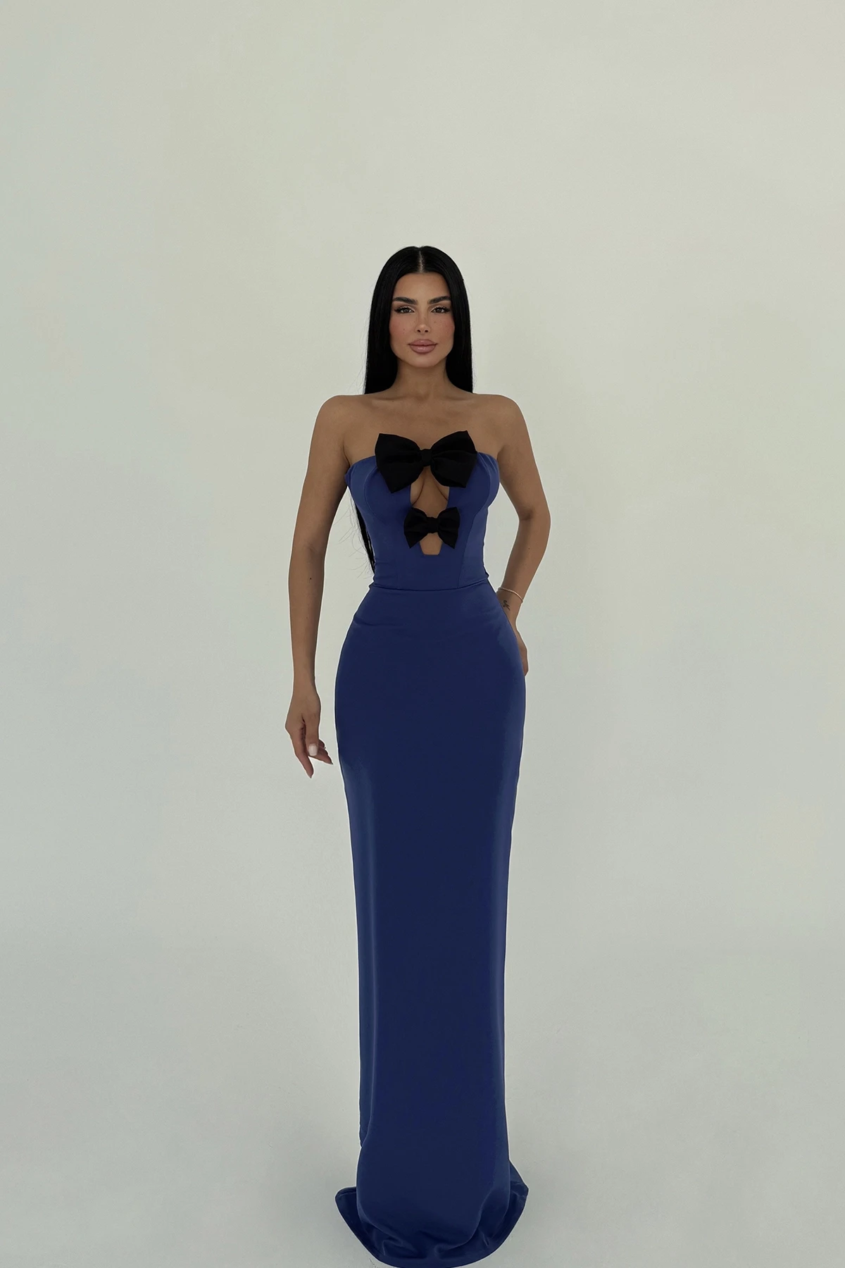 Indigo Arco Bow Detail Dress The image uses size XS. Length: 129 cm Waist: 34 cm Chest: 39 cm Model Measurements Height 158 Weight 52 Chest 80 Waist 62 Hip 93