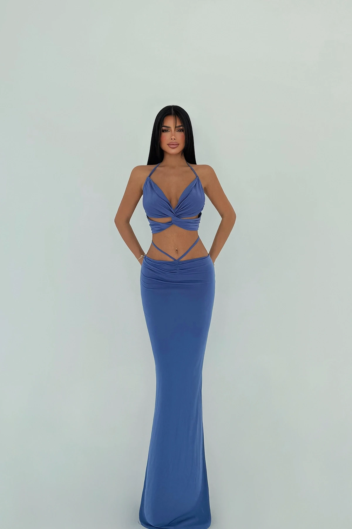 Indigo Bianca Team XS size is used in the image. Suit upper length 26 cm, Chest 38 cm, Bottom length 97 cm, Waist 36 cm Made of Sandy Fabric. Model Measurements Height 158 Weight 52 Chest 80 Waist 62 Hip 93