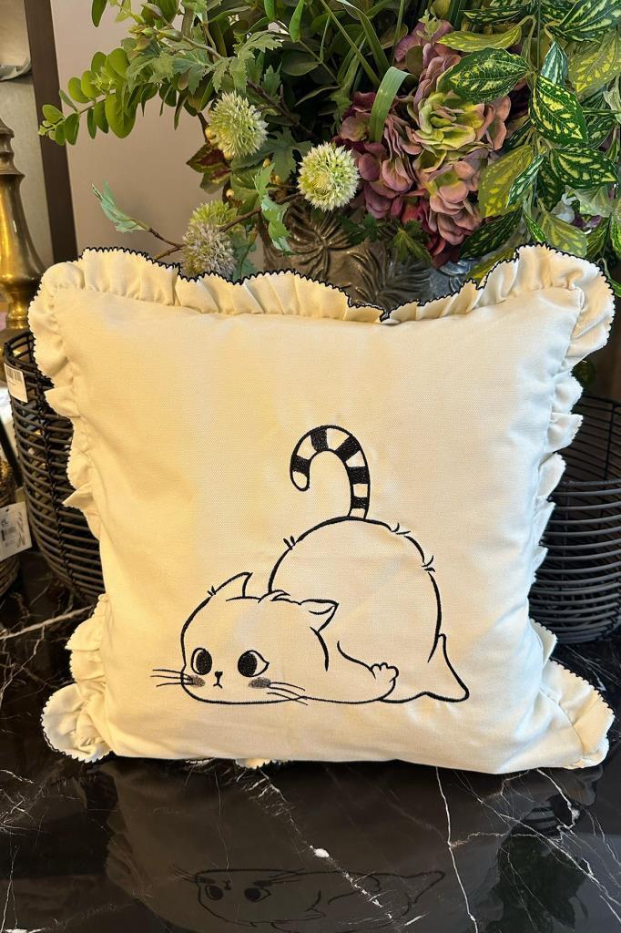 Kedicik Lüx Nakışlı Keten Kırlent Kılıfı 45x45 cm