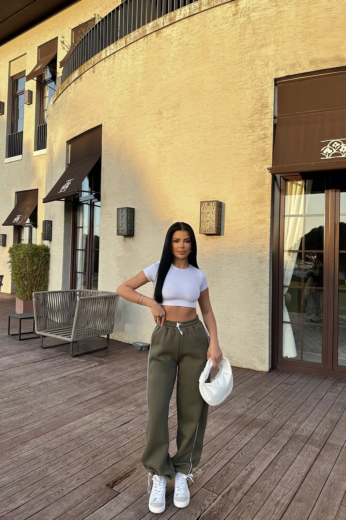 Khaki Basic Sweatpants It is made of Three Thread Raised fabric. Tracksuit length is 102 cm, waist is 34 cm. Size S is used in the image. Model Measurements: Height: 160 Weight: 50 Chest: 80 Waist: 62 Hip: 94
