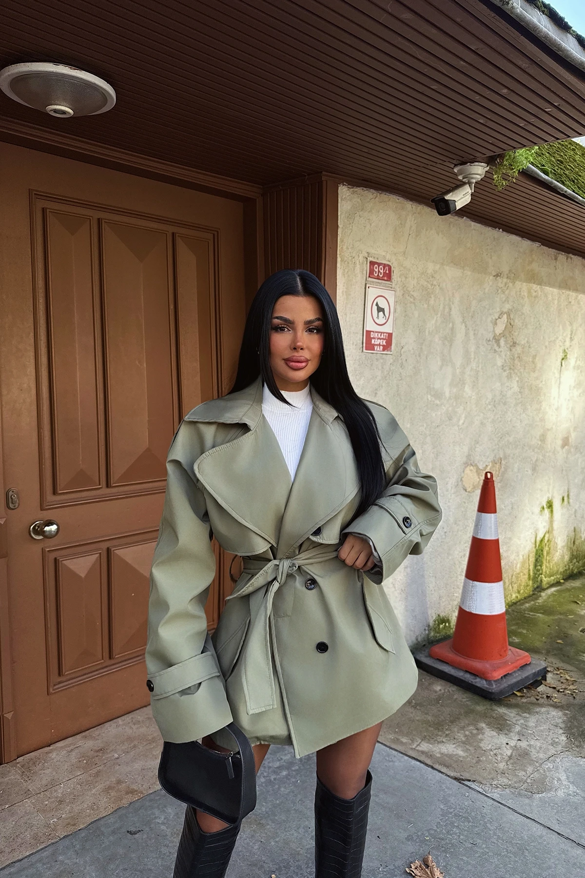 Khaki Button Detail Trench Coat Size XS is used in the image. Height: 80 cm Bust: 61 cm Model Measurements Height 158 ​​Weight 52 Chest 80 Waist 62 Hip 93