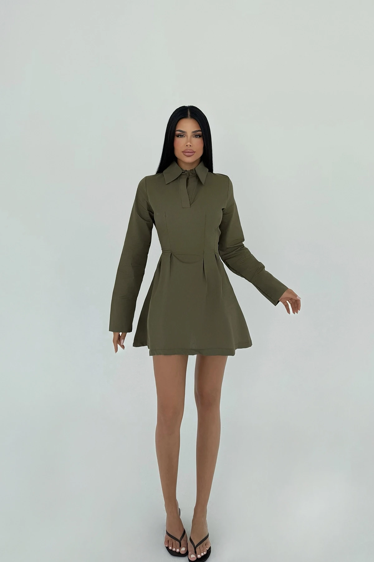 Khaki Herda Flared Dress The image uses size XS. Length: 86 cm Waist: 33 cm Chest: 45 cm Model Measurements Height 158 Weight 52 Chest 80 Waist 62 Hip 93