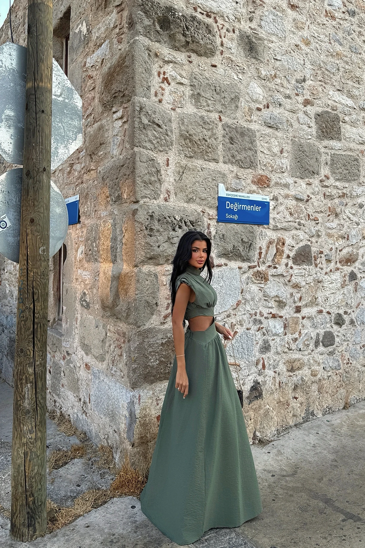 Khaki Long Dress XS size is used in the image. Made of parachute fabric. Dress Length 160 cm, Chest 40 cm, Waist 37 cm Model Measurements Height 158 Weight 52 Chest 80 Waist 62 Hip 93