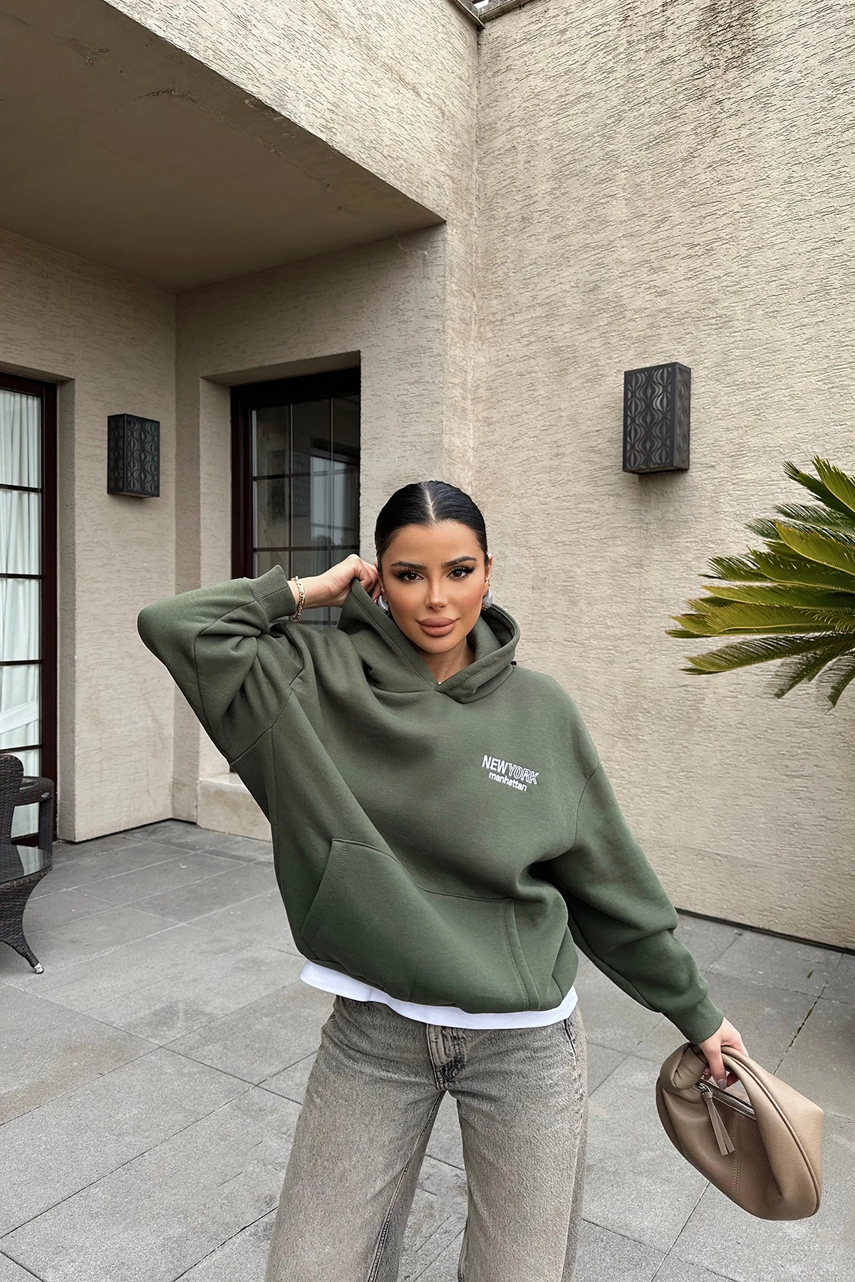 Khaki New York Written Hooded Sweat Made from Three Thread Fabric Size S is used in the image Sweat Length:63cm Chest:51cm Model Measurements: Height: 160 Weight: 50 Chest: 80 Waist: 62 Hip: 94