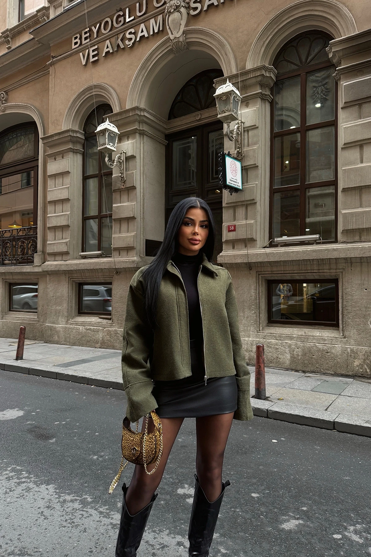 Khaki Shirt Collar Jacket Size XS is used in the image. Made from Stamped Fabric. Height: 61 cm Bust: 59 cm Model Measurements Height 158 Weight 52 Chest 80 Waist 62 Hip 93