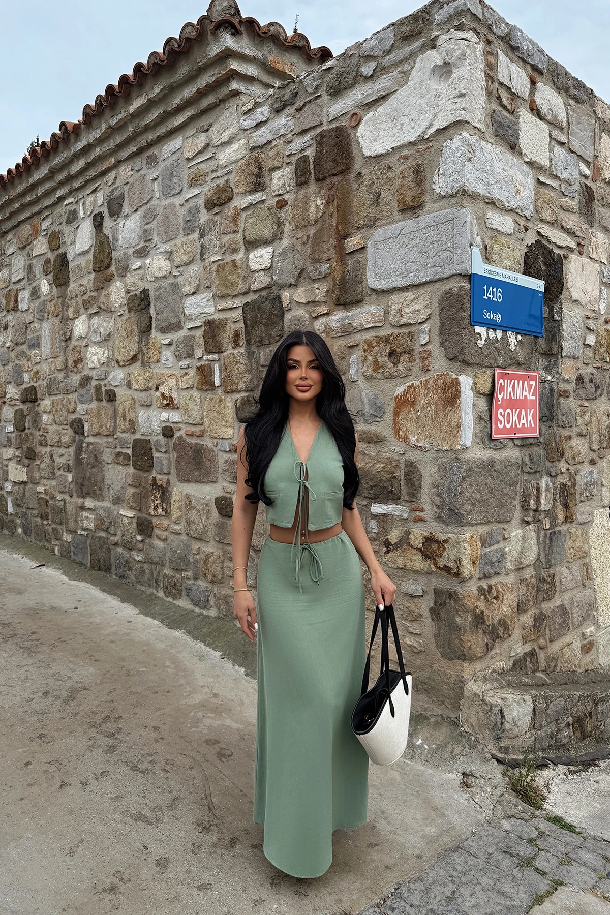 Khaki Stellana Suit XS size is used in the image. Made of Linen Fabric. Suit upper length 41 cm, Chest 40 cm, Bottom length 83 cm, Waist 43 cm Model Measurements Height 158 ​​Weight 52 Chest 80 Waist 62 Hip 93