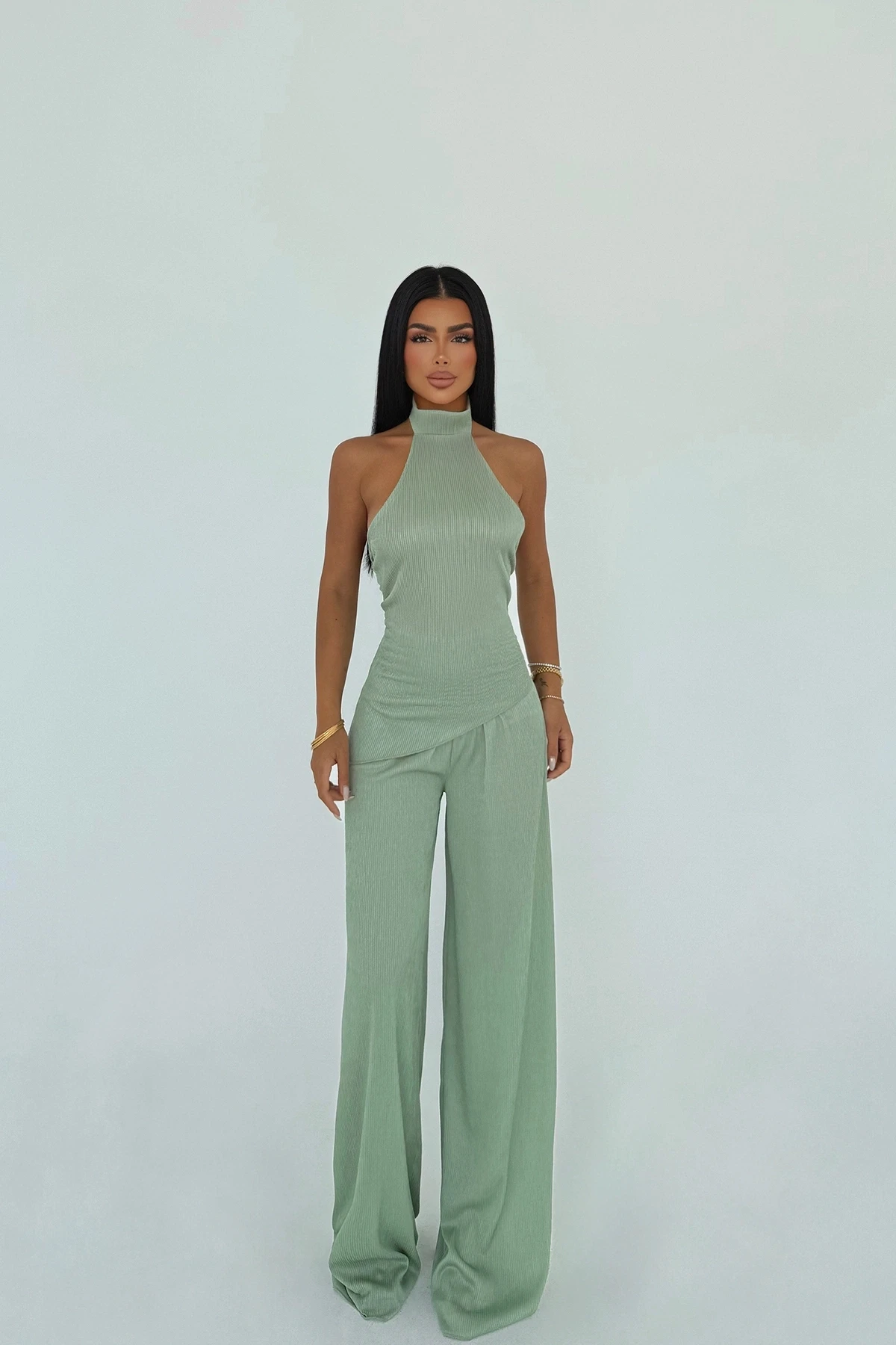 Khaki Trouser Suit Size XS is used in the image. Top Length: 69 cm, Chest: 36 cm, Bottom Length: 110 cm, Waist: 35 cm Model Measurements: Height 158 cm, Weight 52 cm, Chest 80 cm, Waist 62 cm, Hips 93 cm