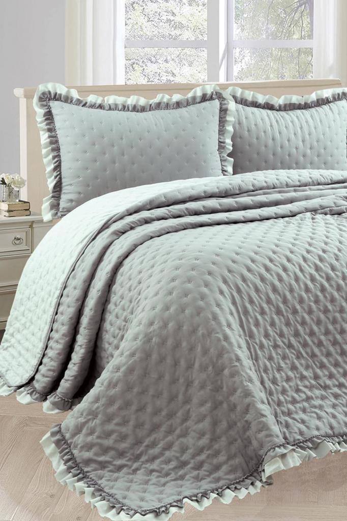 Lamina Fırfırlı Elyaf Dolgulu Çift Kişilik 240x260 Cm Yatak Örtüsü Gri