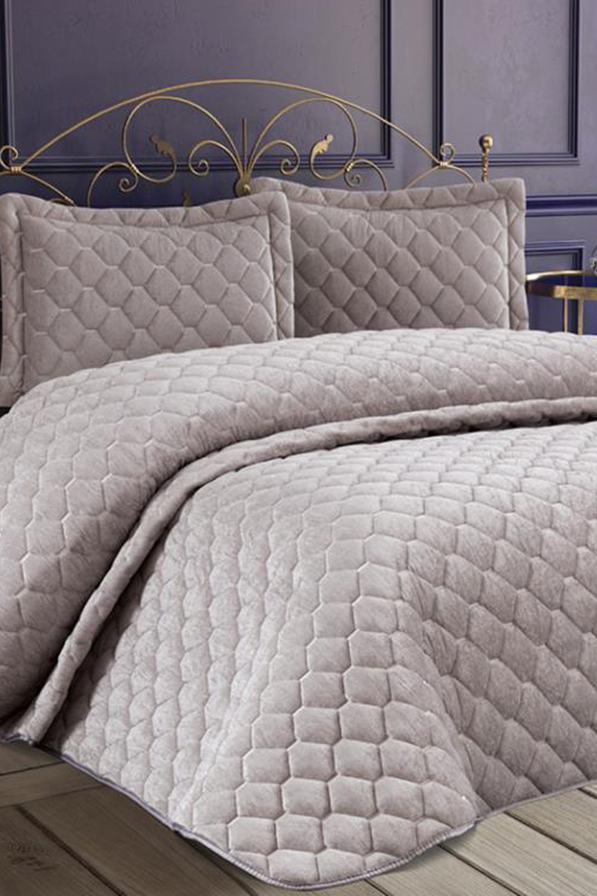 Lima Kadife Dolgulu Çift Kişilik Yatak Örtüsü Gri