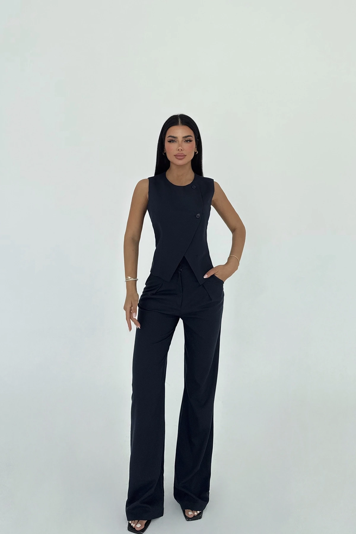 Navy Blue Marly Suit Made of Striped Cloth Foot Fabric. XS size is used in the image. Upper Length: 54 cm Chest: 42 cm Lower Length: 106 cm Waist: 35 cm Model Measurements Height 158 Weight 52 Chest 80 Waist 62 Hip 93