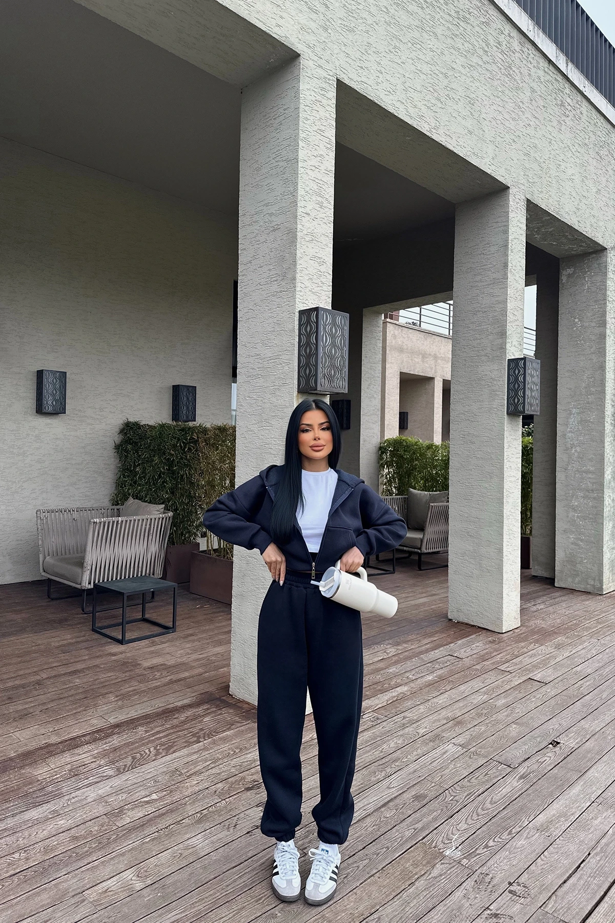 Navy Blue Zipper Detailed Trousers Suit It is made of Three Thread Raster fabric. Size S is used in the image. Suit top length 52cm, Chest 52cm, Bottom length 100cm, Waist 36cm Model Measurements: Height: 160 Weight: 50 Chest: 80 Waist: 62 Hip: 94