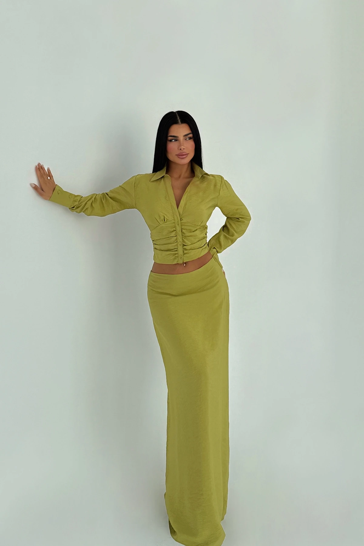 Oil Green Liana Bottom Top Set XS size is used in the image. Made of Linen Fabric. Top Length: 52 cm Chest: 45 cm Bottom Length: 99 cm Waist: 36 cm Model Measurements Height 158 Weight 52 Chest 80 Waist 62 Hip 93