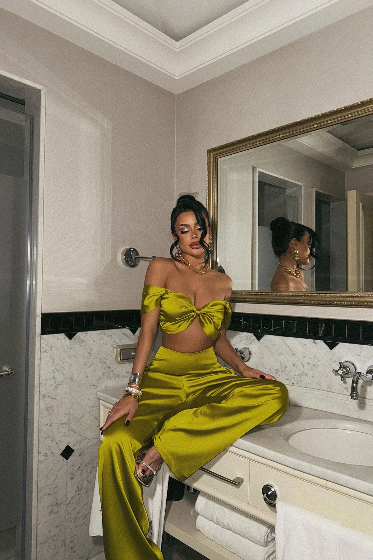 Oil Green Trousers Suit Size XS is used in the image. Top Length: 32 Cm Bust: 34 Cm Bottom Length: 105 Cm Waist: 35 Cm Made from Satin Fabric. Model Measurements Height 158 Weight 52 Chest 80 Waist 62 Hip 93