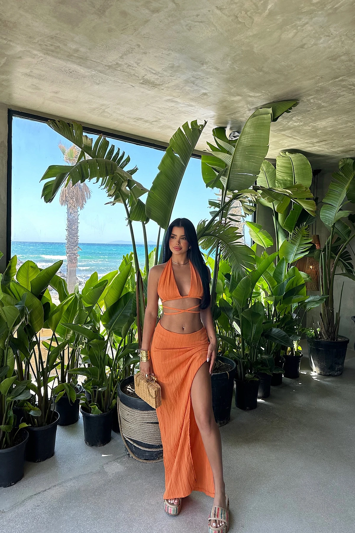 Orange Lona Tie-Up Suit It is made of Elisa fabric. Size S is used in the image. The skirt is half lined and zippered. Suit top length 37 cm, chest 32 cm, Bottom length 100 cm, Waist 39 cm, Slit Length: 70 cm Model Measurements: Height: 160 Weight: 50 Chest: 80 Waist: 62 Hip: 94