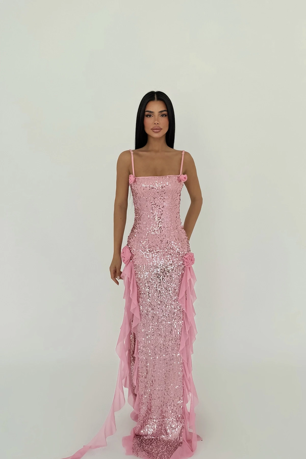 Pink Paxton Sequined Long Slit Dress The image uses size XS. Made of Sequin Pallet- Denier Lining Fabric. Length: 162 cm Waist: 34 cm Chest: 37 cm Model Measurements Height 158 Weight 52 Chest 80 Waist 62 Hip 93