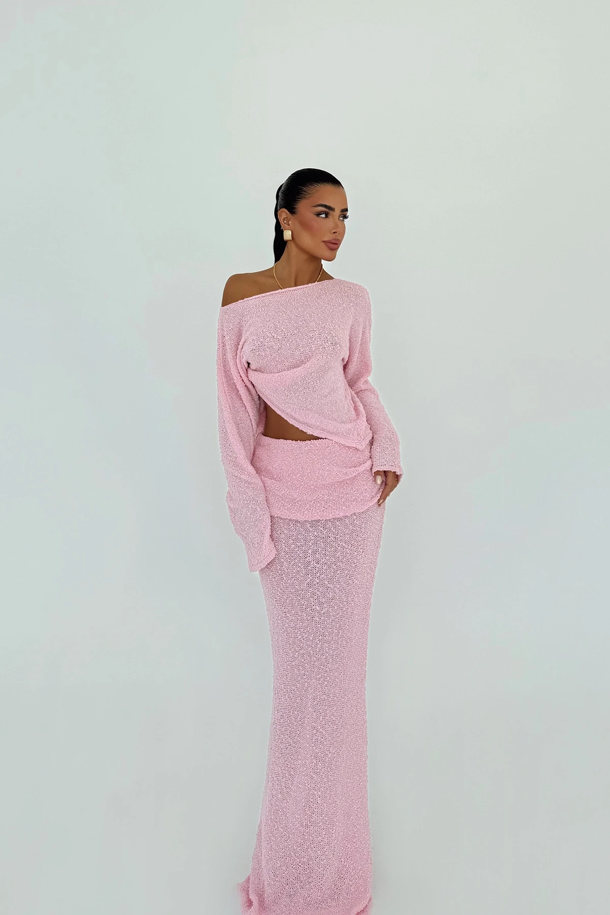 Pink Skirt Suit Standard size is used in the image. Top Length: 50 cm Chest: 60 cm Bottom Length: 102 cm Waist: 32 cm Model Measurements Height 158 Weight 52 Chest 80 Waist 62 Hip 93